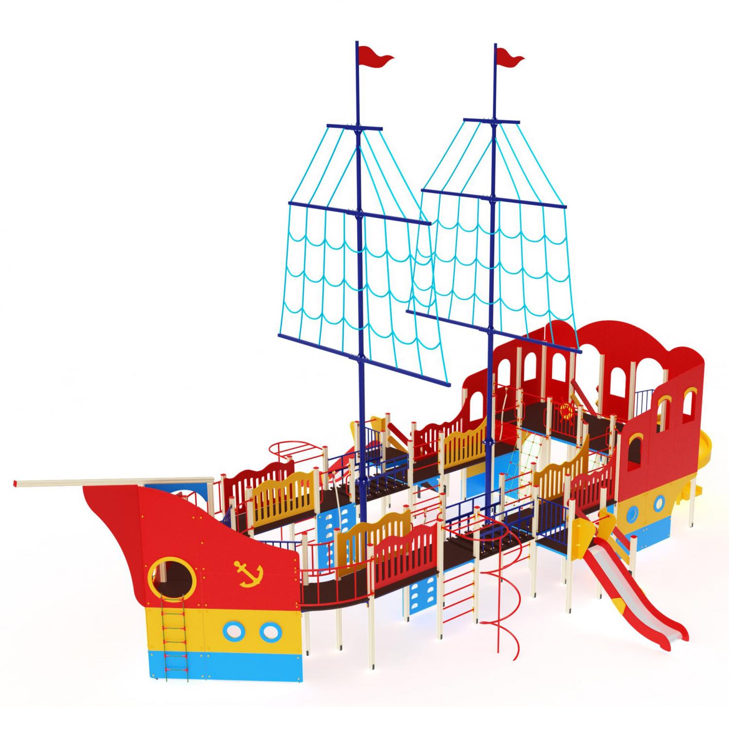 Декоративные элементы (1 комплект) Комплекс стилизован под парусник и включает декоративные борта, ограждения мостов различных размеров, накладку-якорь, имитацию парусов, выполненную из каната. Элементы изготовлены из влагостойкой фанеры различных размеров и толщин.