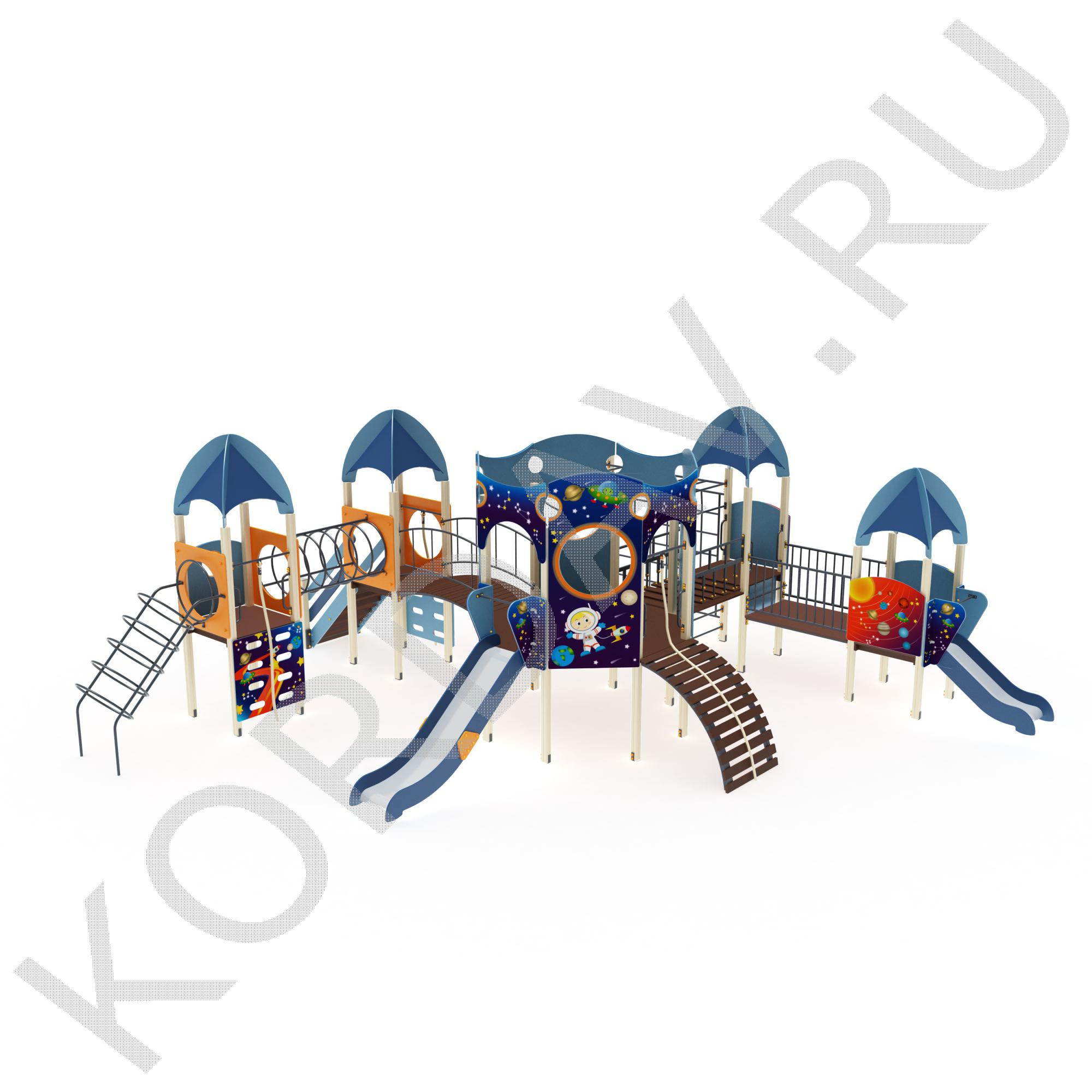 Комплектация игровой площадки «Космос»: лаз металлический; 3 башни с четырехскатной крышей; 1 башня с аркой; мост подвесной; 1 башня восьмигранная без крыши; скат-горки высотой 1,2 м и 750 мм; мост на дугообразном каркасе с ограждениями; щит-скалолаз с отверстиями для зацепа; лестница высотой 1,2 м; полиуретановый канат диаметром 30 мм; рукоход; лаз-решетка; металлическая наклонная труба из 7 колец; труба-мост; подвесной мост переходной. Для изготовления детской площадки использованы следующие материалы: труба круглая 32 и 27 мм; антискользящая фанера ламинированная 18 мм, 24 мм; брусья клееные 100х100 мм; фанера влагостойкая 9, 18, 30 мм; сталь нержавеющая шириной 540 мм и толщиной 1,5 мм; профиль стальной 40 х 25 мм, 15 х 15 мм; полосы металлические 40 х 4 мм; уголки стальные 40 х 40 х 4 мм. Покрытие металлических частей порошковая краска, покрытие для фанерных и деревянных деталей акриловая и полиуретановая краски.