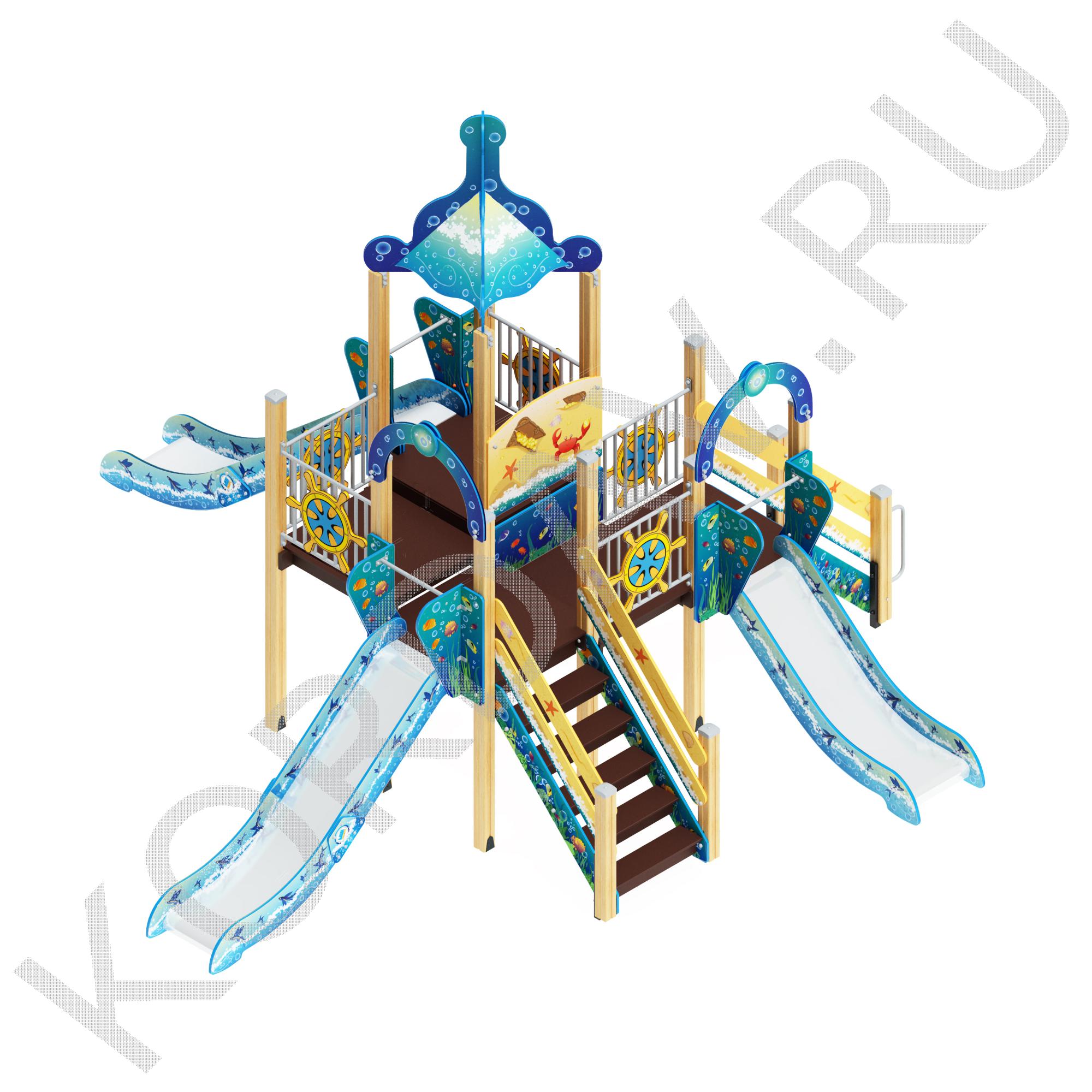 Игровая площадка выполнена в морской тематике украшена разными декоративными элементами: якорями, спасательными кругами, капитанскими штурвалами. Конструкция состоит из высокой башни с четырехскатной крышей; трех скат-горок высотой 900, 1200 и 1500 мм; лестницы высотой 1200 мм и 900 мм; ограждения на башне. Для изготовления площадки использованы: полотна нескользкой ламинированной фанеры 18 мм; лист влагостойкой фанеры 18,27,30 мм; брусья клееные 90х90 мм; нержавеющая сталь – цельный лист толщиной 1,5 мм и шириной 540 мм; профиль стальной 25х40 мм; круглая труба 32,27 мм; уголки металлические 40х40х4 мм. Для безопасности детей, на фанерных и стальных элементах нет острых кромок. Для покраски дерева и фанеры использован акриловый грунт и двухкомпонентная полиуретановая краска. Порошковое окрашивание использовано для покрытия металлических элементов.