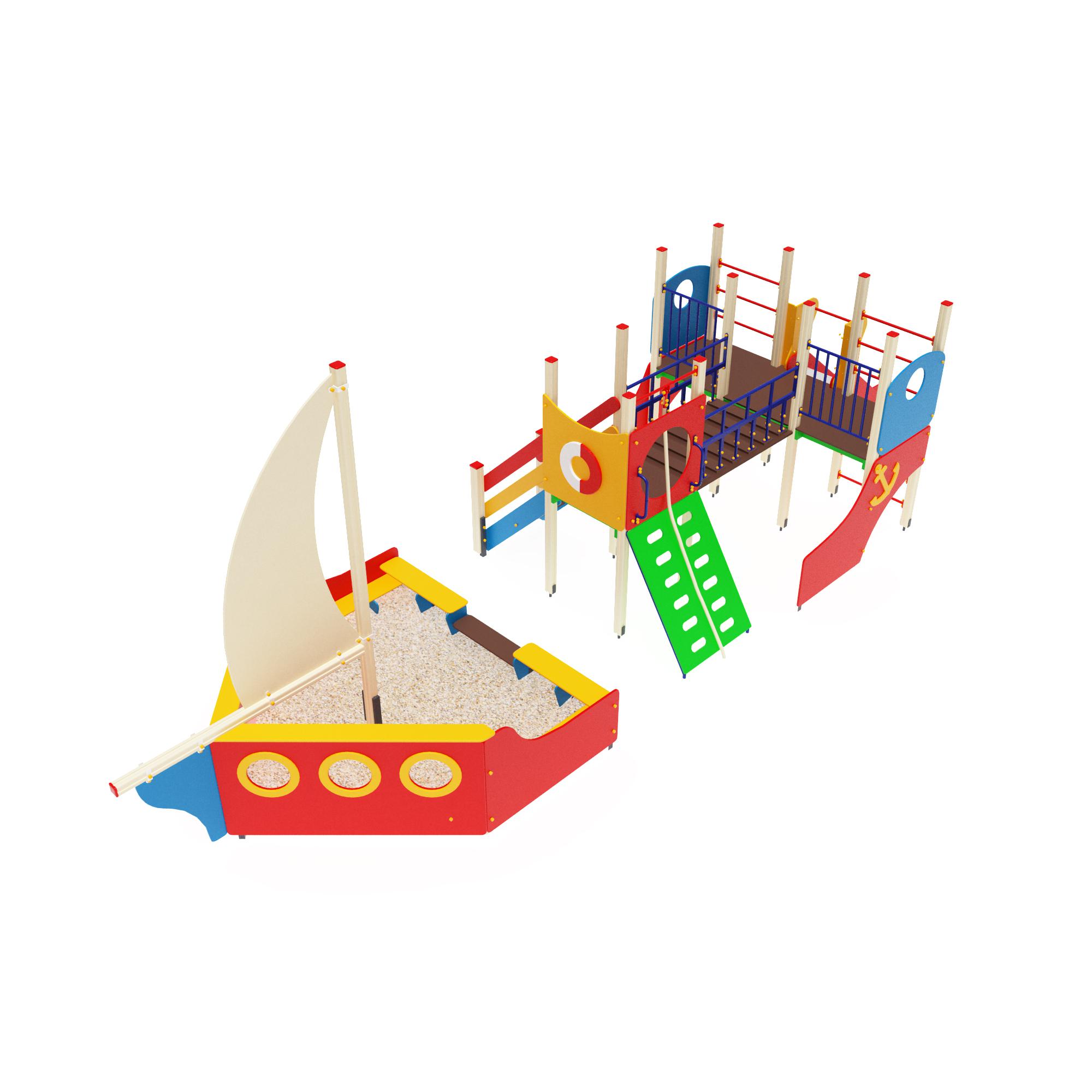 Комплектация изделия: песочница с двумя скамьями, декоративным парусом и бортами; скалолаз с канатом 30 мм; лестница с перилами; мост; скат-горка; 2 шведские стенки.